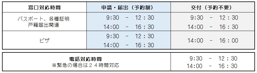 急を要する手続き等(ビザ申請を除く)がある方は、午前9:30-午前11:00の間(時間厳守)、ご予約なしで来館が可能です。ただし、ご予約の方を優先しご案内するため、当日の窓口の混み具合等によっては、長時間お待ちいただくことや、後日再度来館をお願いする場合がありますのでご留意下さい。
