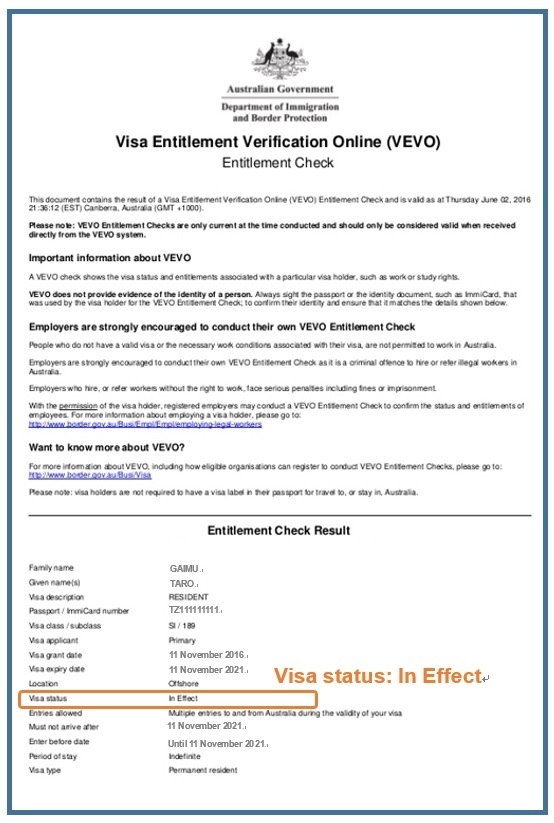 下記オーストラリア移民局の「VEVO」サイトにて保持するビザの有効性が確認できますので、VEVOビザ情報を印刷してお持ちください。