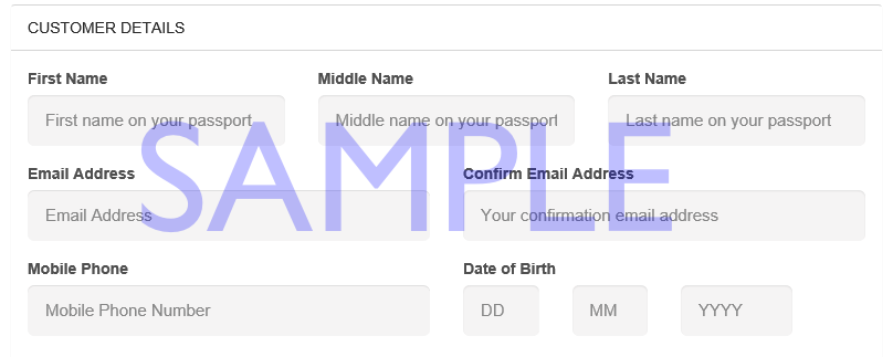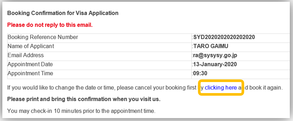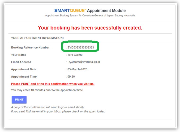 Please check your booking reference number. When you click “SUBMIT” button, the booking will be completed and the confirmation prompt message will be popped up with a unique booking reference number SYD03333333333. Please take the screenshot or write it down accurately as you will be required to input the number into the check-in Kiosk when you arrive at our office. The confirmation email will be also sent to your nominated email address.