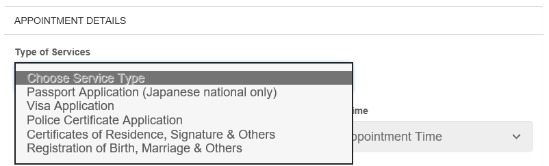 2. 「Type of Services」(手続き項目)、来館日時を選択 Select Type of Services, and Date and Time from the drop-down menu