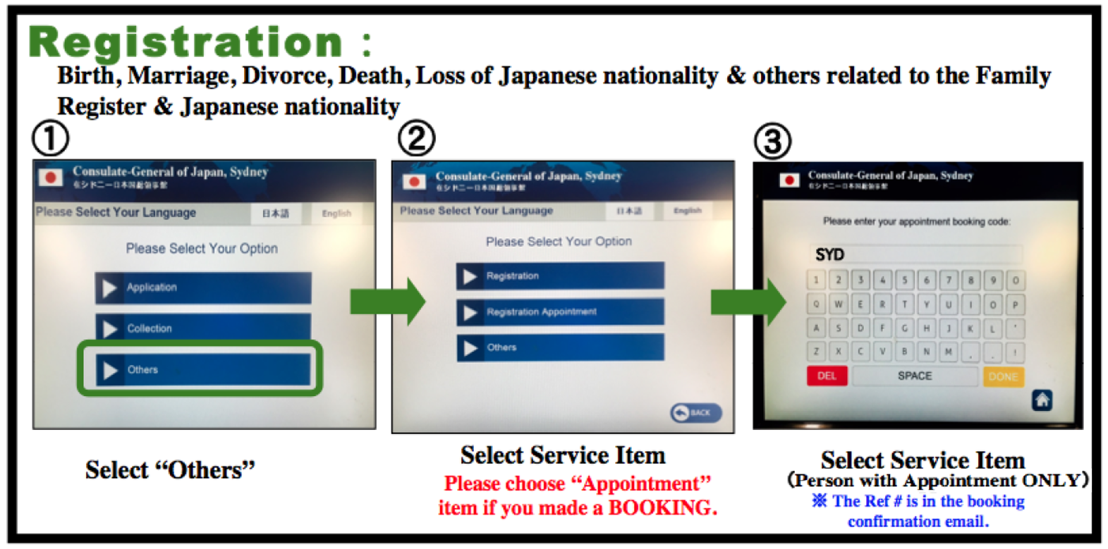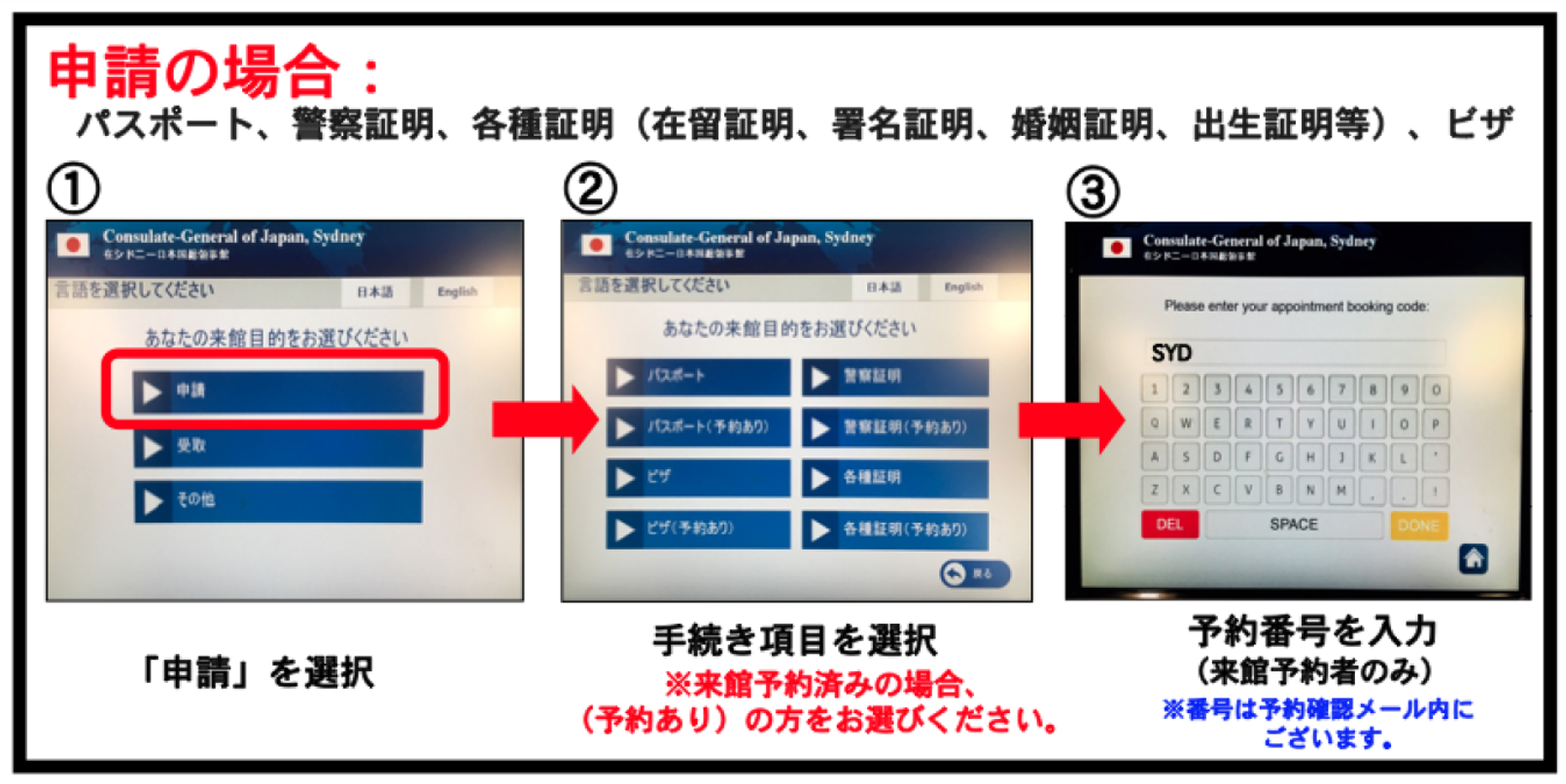 Please check-in from the kiosk ticket machine to enter our office when you arrive. For that, you are required to select the type of service and input the booking reference number on the screen. Please prepare for the reference number beforehand. As a numbered ticket will be issued, please take it and wait until your number is called.